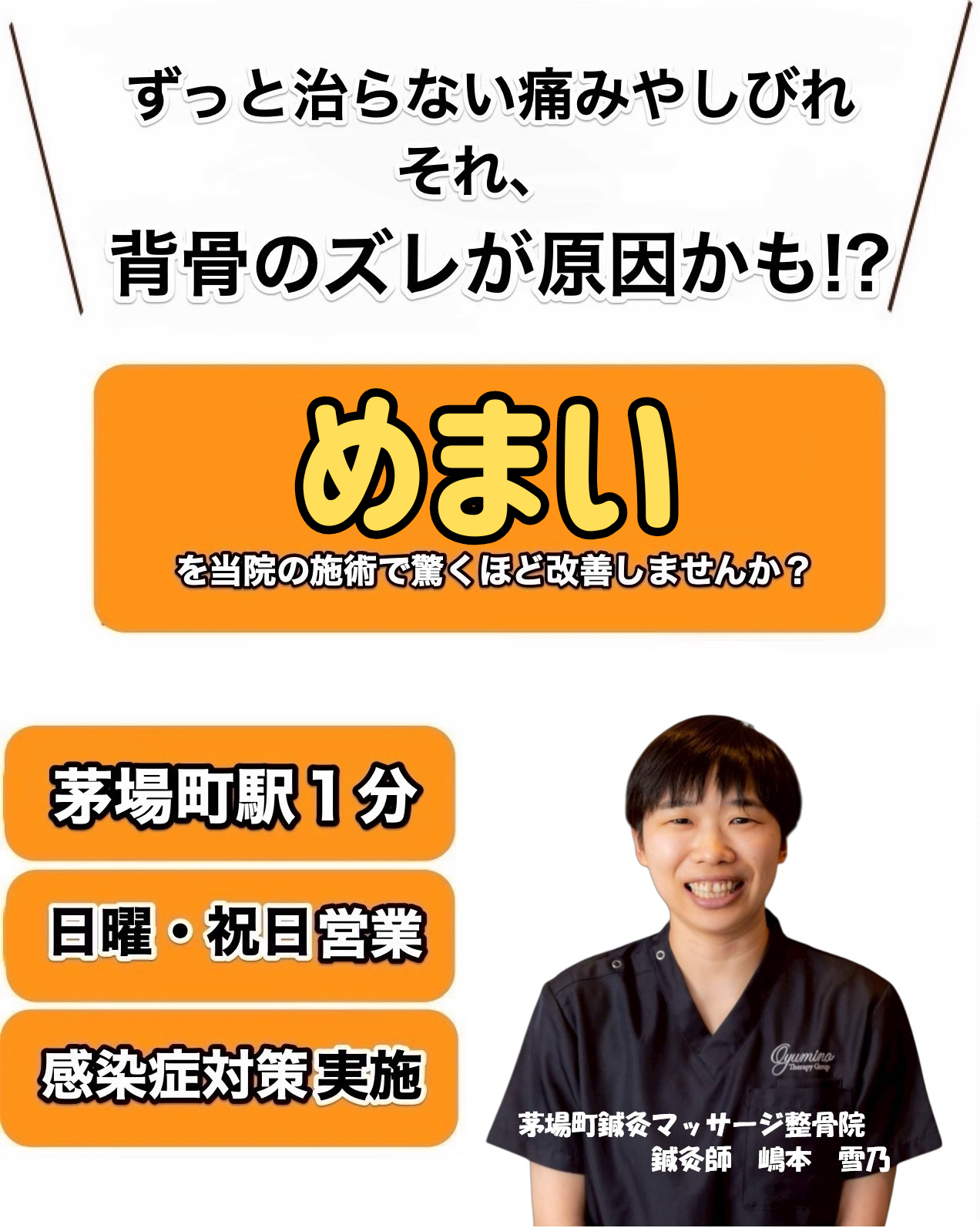 整体の観点からは、特に体のゆがみや自律神経の失調に注目し、これらを整えることでめまいの根本的な改善を目指します。